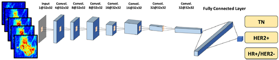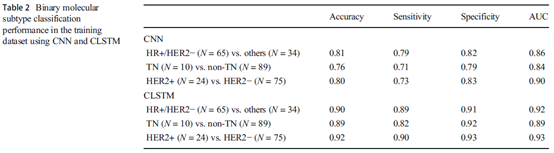 方法:根据激素受体(HR)和HER2受体分为3个亚型:(HR+/HER2−), HER2+ 和三重阴性(TN);利用传统CNN和卷积长短期记忆网络(CLSTM),以覆盖肿瘤ROI的最小包围盒作为深度学习的输入,在训练数据集中建立模型;然后,运用迁移学习对模型进行重新调整,并在测试集中进行评估。