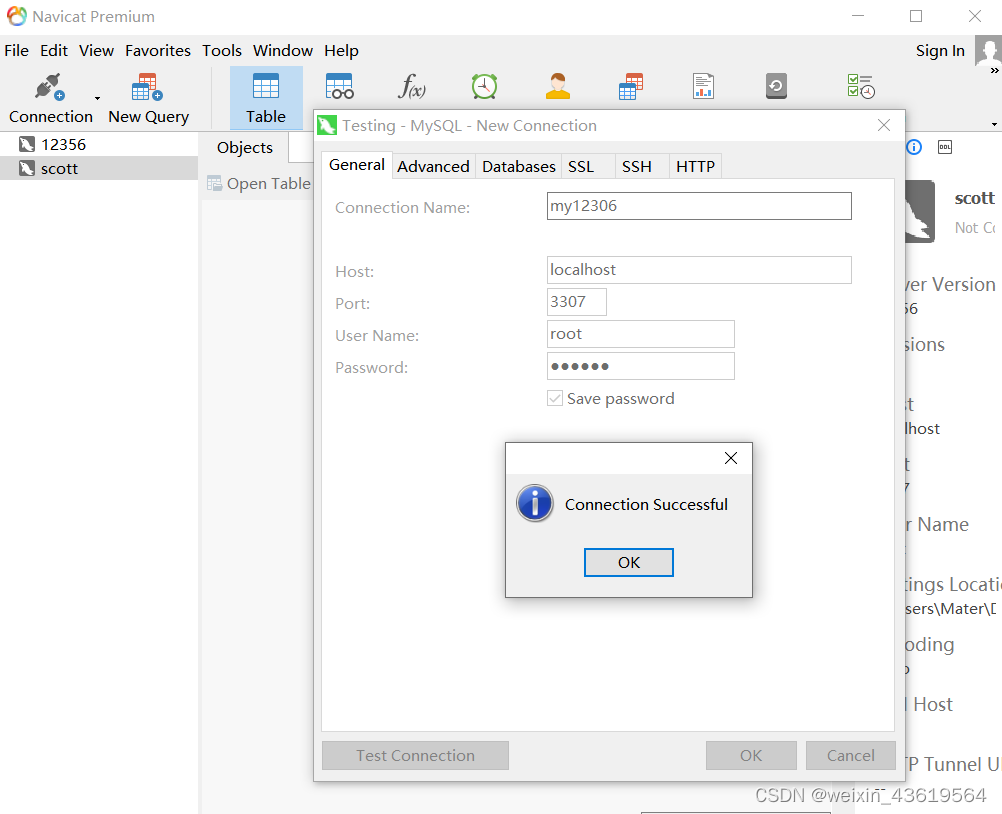 端口号一般是3306,只是我起的是3307,只有你的端口号,密码,Usernam,Host与你安装的数据库mysql的一样点击测试连接,才会显示Connection successful,这样子才可以使navicat与mysql数据库联系起来。