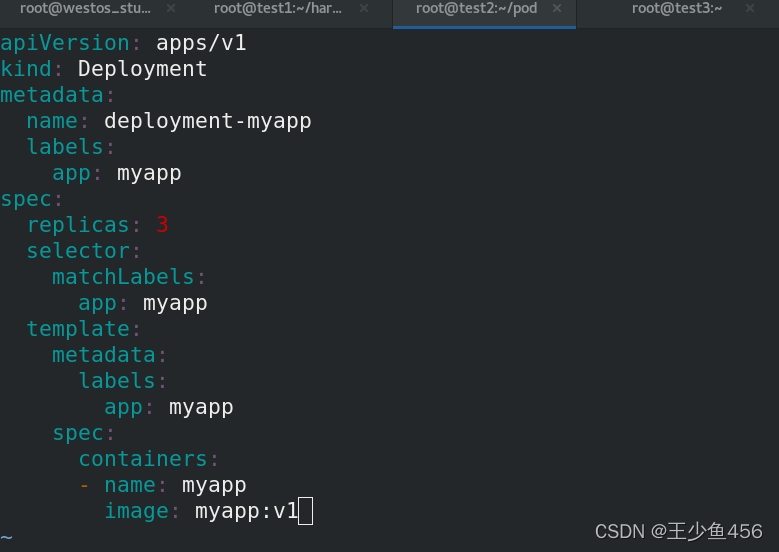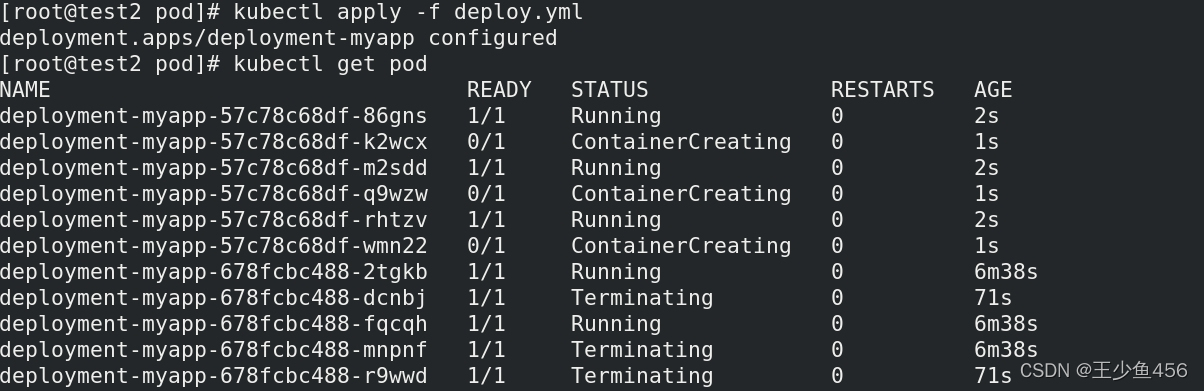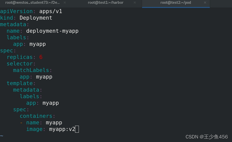 (5)编辑deploy.yml,设定deployment控制器生成的副本使用v2版本的myapp镜像,读取应用该文件(滚动更新和回滚)