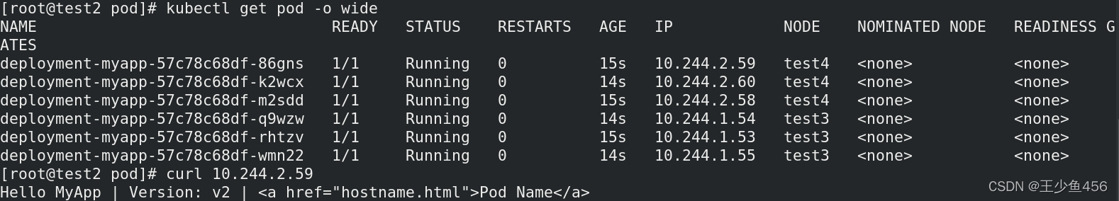 查看pod资源额外信息可以得到生成的pod副本的ip,curl访问任一pod副本分配到的ip,是myapp:v2镜像的默认发布页面,pod副本镜像版本迭代更新成功