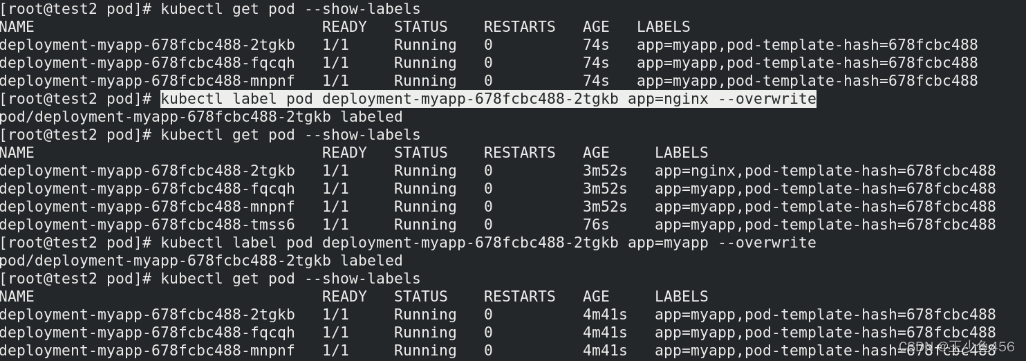kubectl label pod deployment-myapp-678fcbc488-2tgkb app=nginx --overwrite ##更改并覆盖标签
