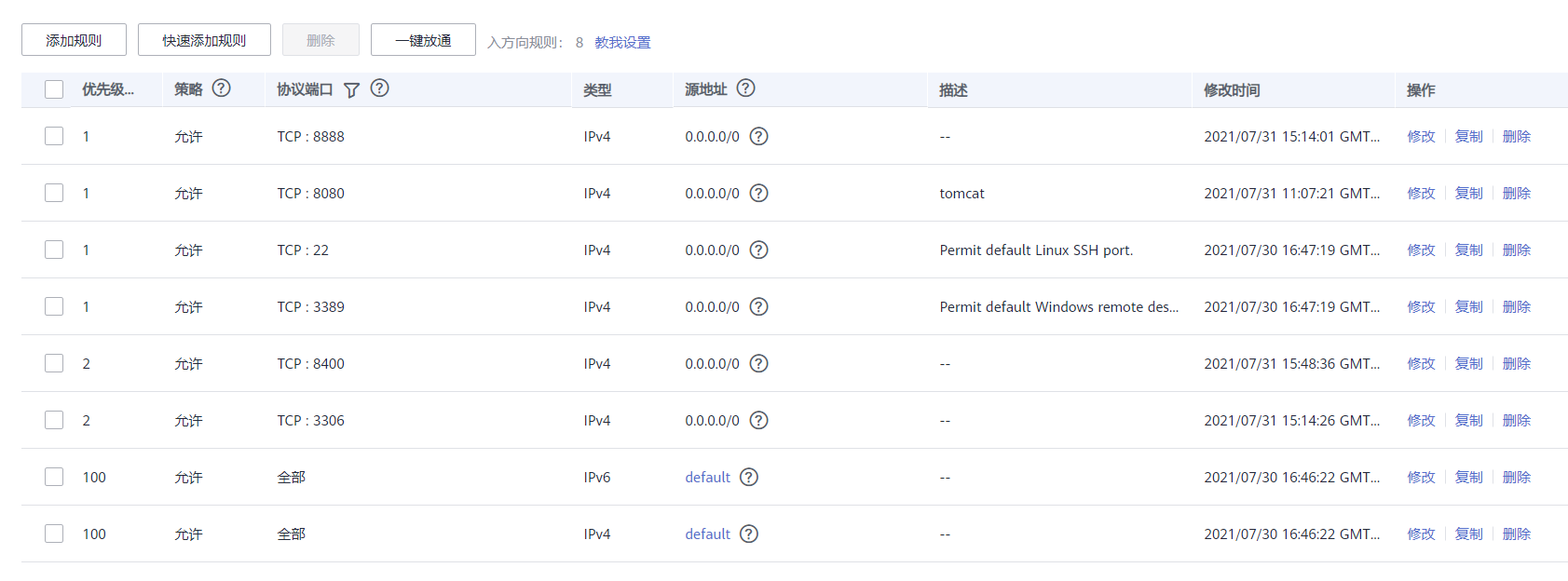 1.进入服务器实例,更改安全组,新建安全组,添加规则,添加8888端口(宝塔面板)和8080端口(tomcat)、3306(数据库连接)、8400(springboot项目的端口,不固定)、22(ssh端口)