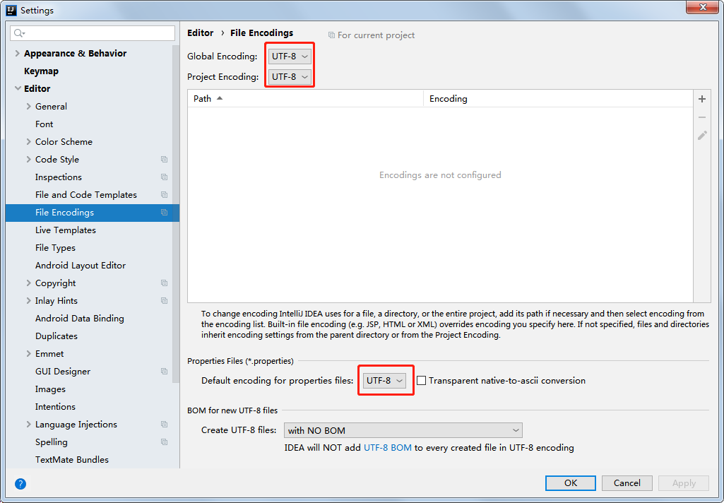 2.然后从File->Setting ,设置File Encodings ,检查Default Encodings 是否是UTF-8.