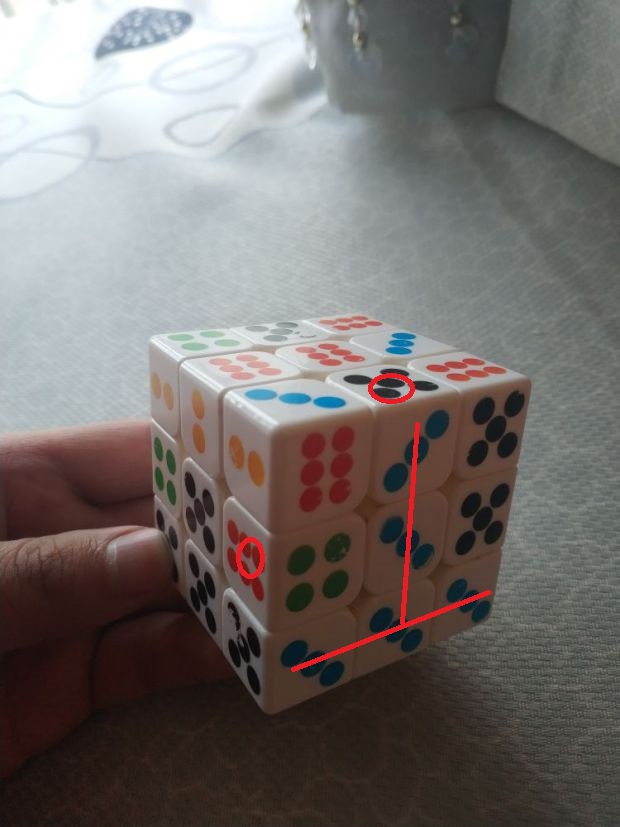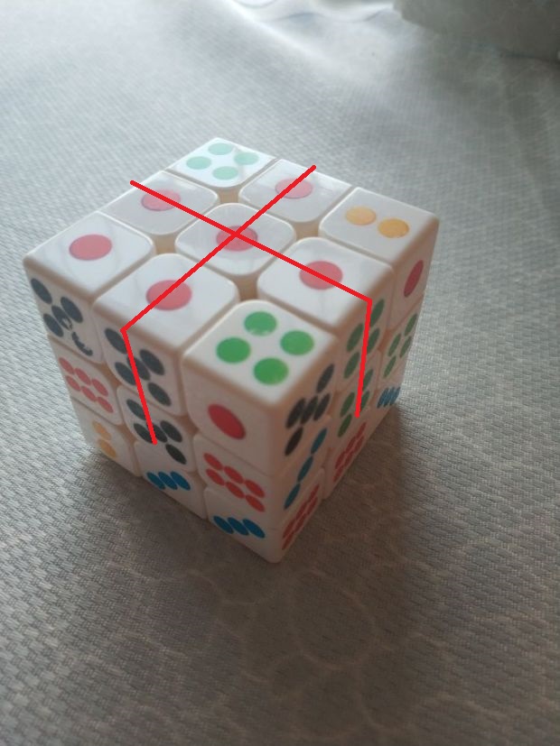 4.拼第二层:底面朝下,在顶面中间的快找到不包含顶面颜色的块,比如这里顶面是6,中间的3、5组成的块不包含6,然后转动顶层让这个中间块对齐相应的T字,如图。