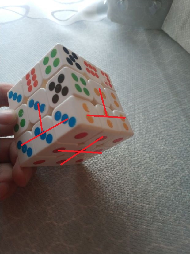 6.拼顶面:顶面十字拼好后,把顶面朝向左边,底面朝右,然后记住或者说固定此时的前面和上面,比如说我现在的前面和上面是5和3,等下转动是5和3一直是这个朝向。