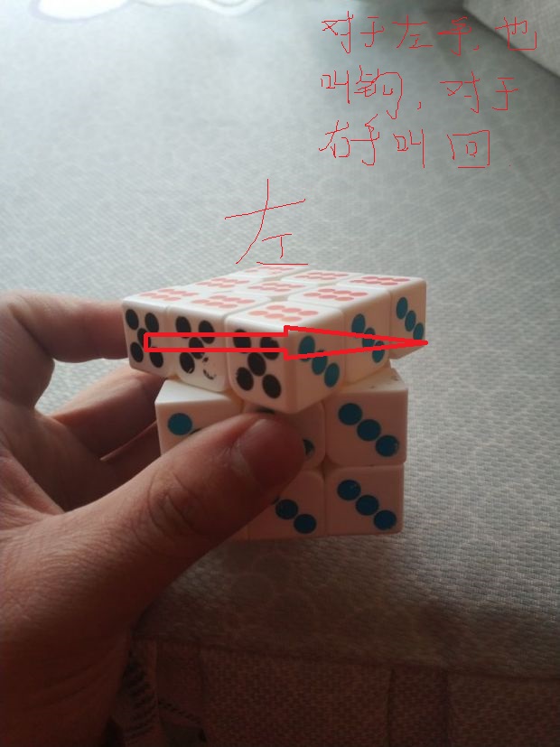 然后把对齐的T字朝自己,后面统一叫前面。这时候会发现5面在自己左手边,这个时候左手先做公式:钩 上钩下回,然后把大T字转到右边,右手做一遍公式:上钩下回。同理,如果5面在右手边,反过来就行(右手先做公式:钩 上钩下回,然后把大T字转到左边,左手做一遍公式:上钩下回)。ps:有时候顶面中间的块都会包含顶面,这个时候也先做一遍左右手公式。