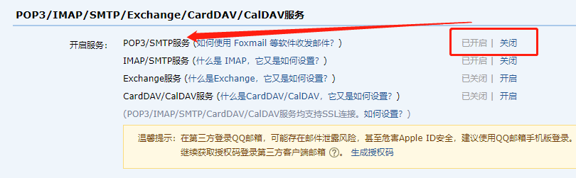 在下面找到 POP3/IMAP/SMTP/Exchange/CardDAV/CalDAV服务选项,设置SMTP服务开启并生成授权码(其他邮箱也是类似的操作,注意保存好授权码)