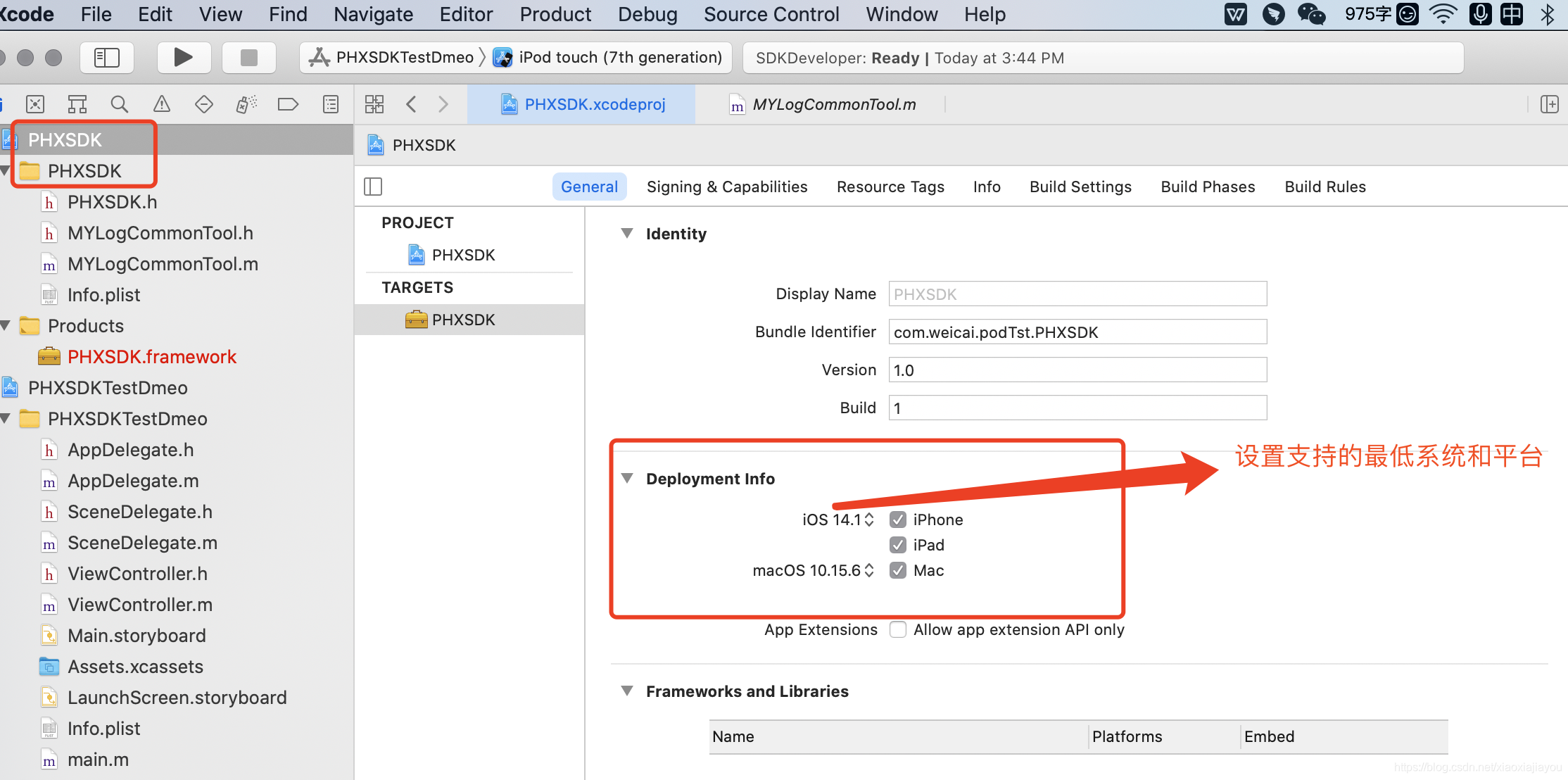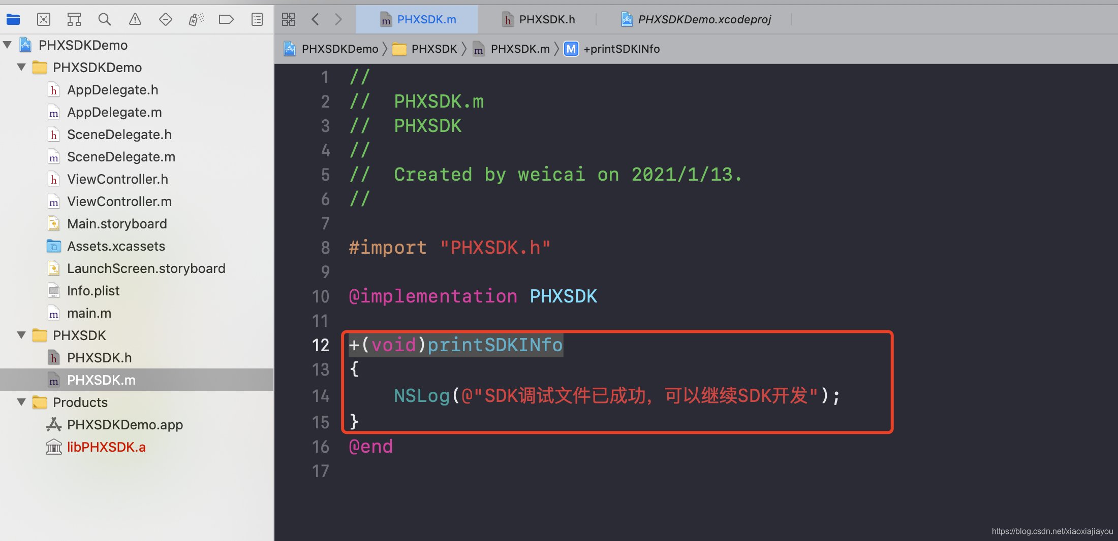 进行SDK逻辑开发,我暂时输出 +(void)printSDKINfo 方法来验证 PHXSDK