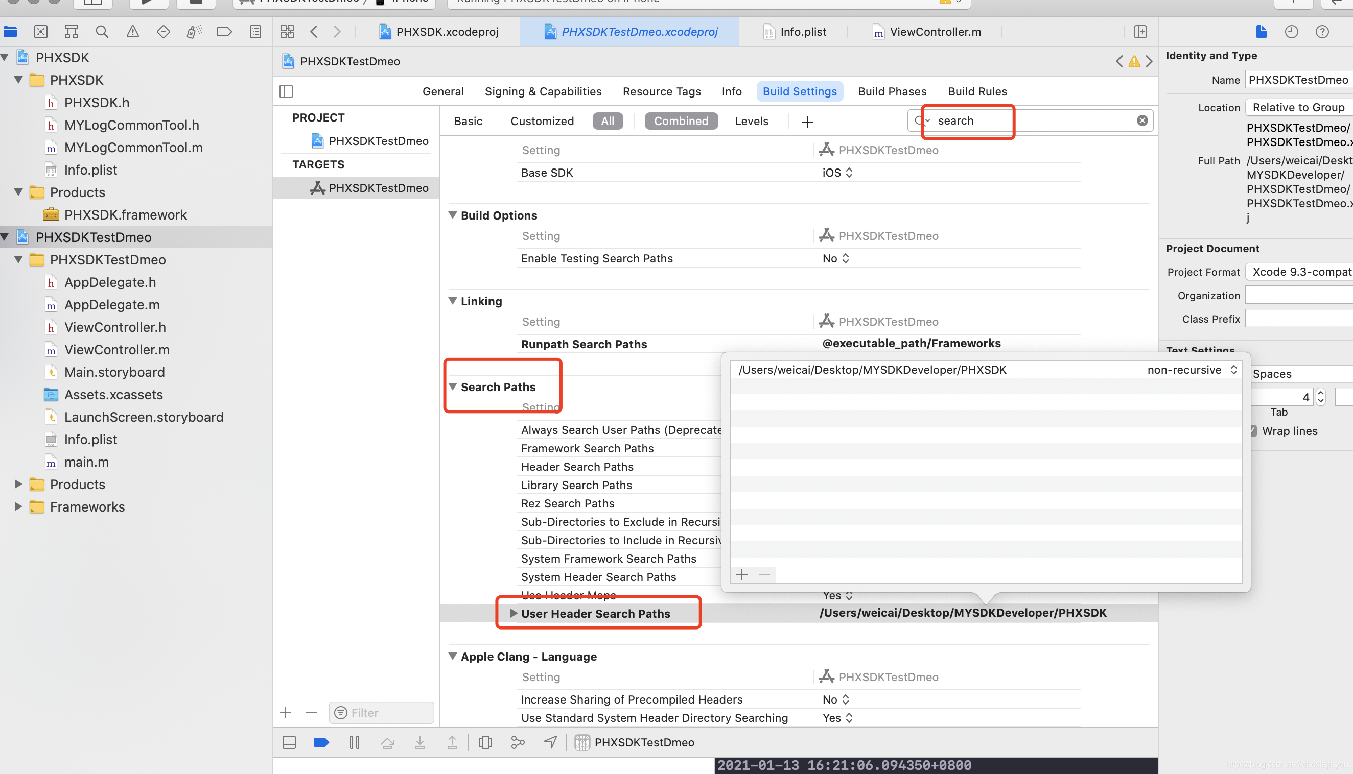 需要将 PHXSDK 文件路径引入到 PHXSDKTestDmeo 中,配置如下: