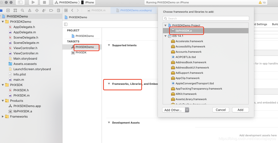 PHXSDKTestDmeo工程 引用 PHXSDK.framework 功能验证
