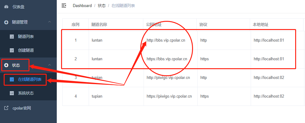 在保留好cpolar云端的空白数据隧道后,就可以转回本地cpolar客户端,对云端保留的空白数据隧道进行配置,让其能与本地的Discuz网页连结起来。与cpolar的云端设置一样,在cpolar客户端配置数据隧道,也需要进行相应的设置,设置内容包括“隧道名称”、“协议”、“本地地址”、“域名类型”、“Sub Domain栏位”和“地区”,详细的配置内容如下图所示。完成这些设置后,就可以点击页面下方的“创建”,完成本地Discuz网页与cpolar云端数据隧道的连接。而Discuz网页的公共互联网地址可以在“状态”项下的“在线隧道列表”页面找到。