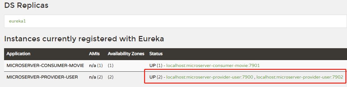 可以看到通过application.name是可以访问注册的服务的。那么下面测试一下负载均衡。我们在user工程7900端口启动的情况下,修改user工程的application.yml的端口为7902,: