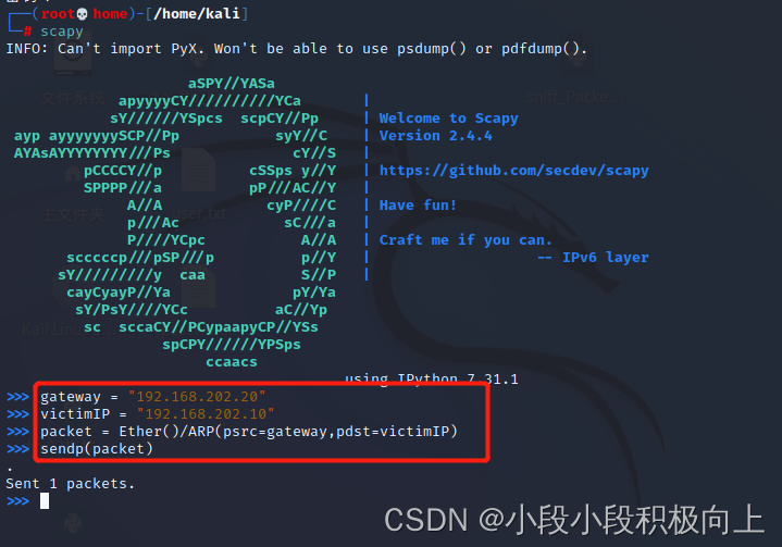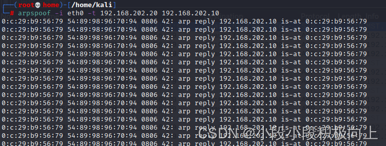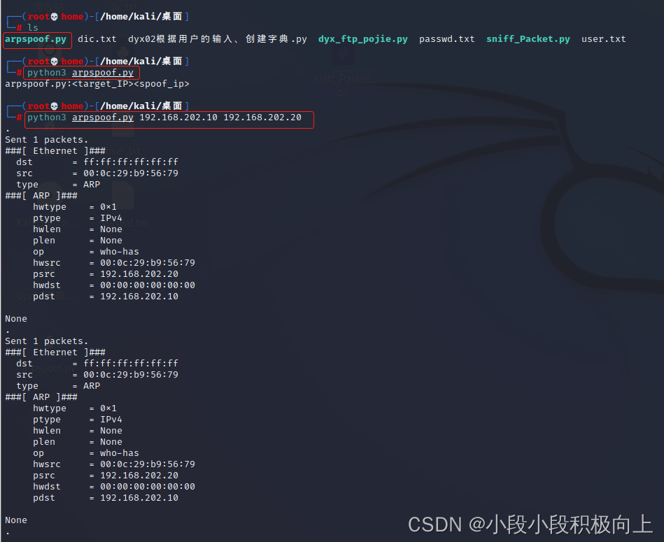 完整的程序如下所示。: 只是发给 被攻击的目标主机的 包; 还需要再构造一个 发给网关的数据包;同时kali开启流量转发
