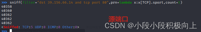 >>> sniff(filter="dst 39.156.66.14 and tcp port 80",prn=lambda x:x[TCP].sport,count=5)