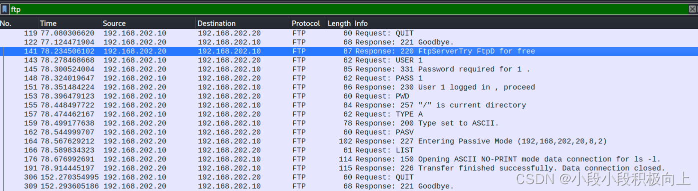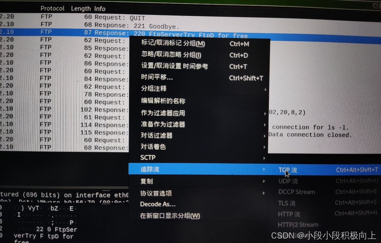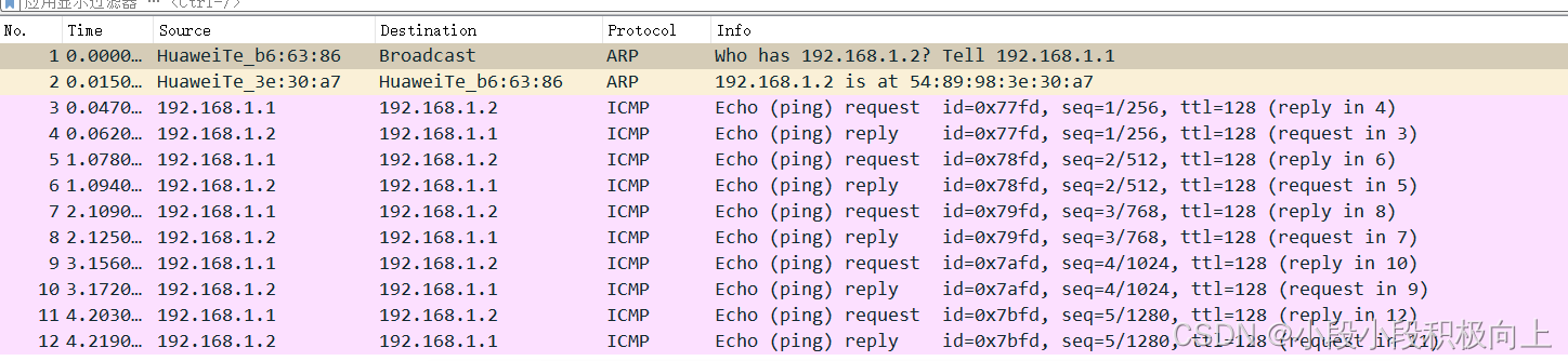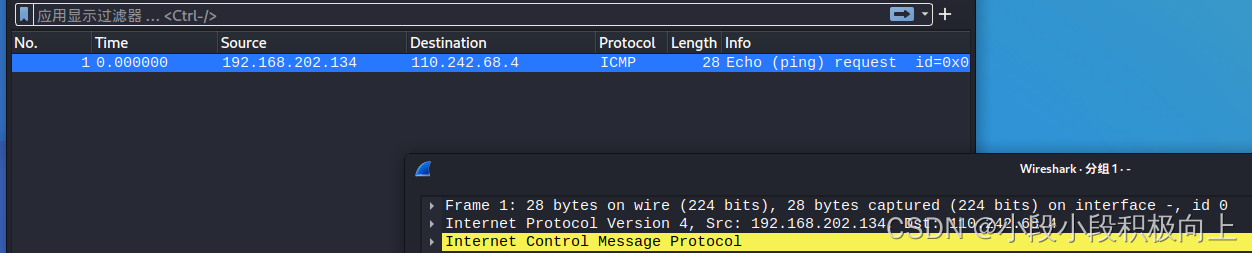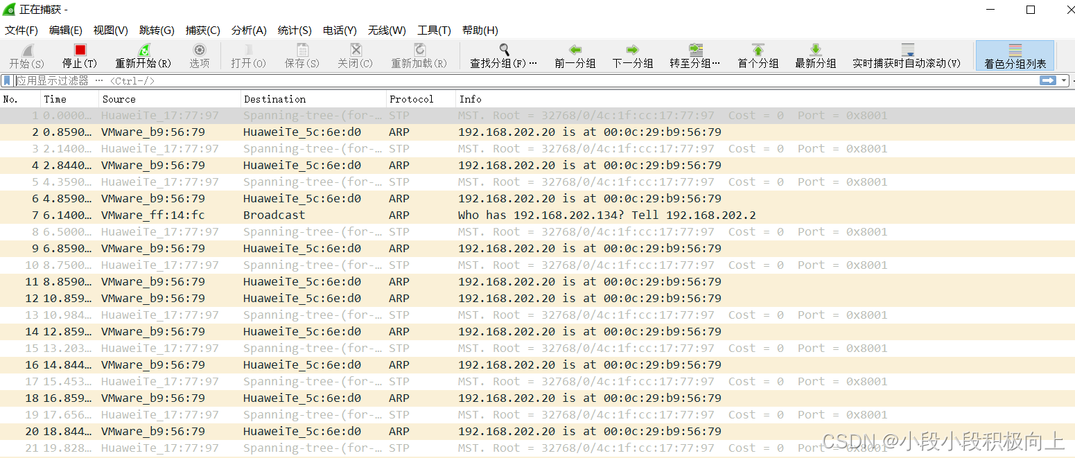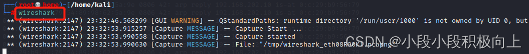 首先arpspoof仅仅是会截获这些数据包,并不能查看这些数据包,所以还需要使用专门查看数据包的工具 打开WireShark,就可以看到受害者所发送的数据包