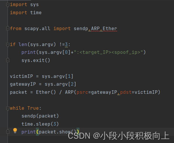 利用这个库实现中间人欺骗的原理和前面一样,也是通过向目标发送一个伪造了的ARP请求数据包来实现的