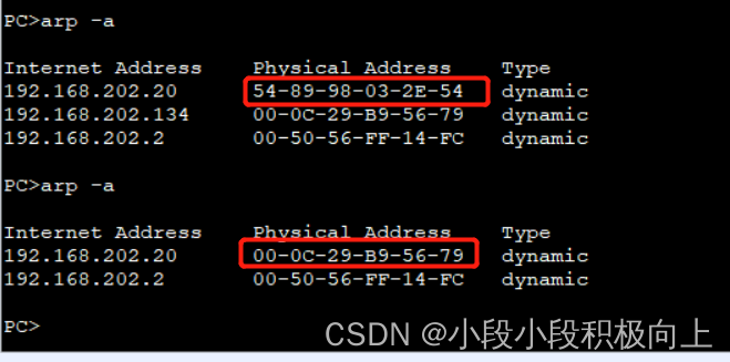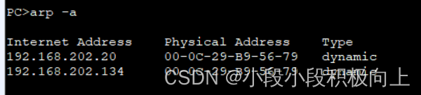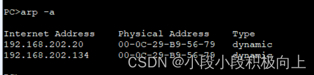 在目标主机中查看ARP缓存表,可以看到这时这个缓存表已经受到欺骗