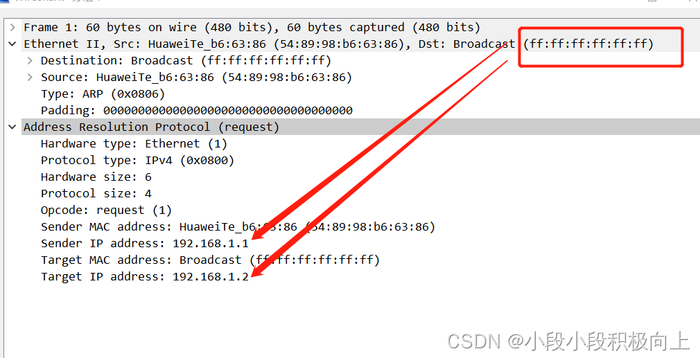 (3)帧类型:0x0806表示ARP类型,使用两位十六进制表示为\x08\x06。