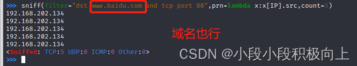 >>> sniff(filter="dst www.baidu.com and tcp port 80",prn=lambda x:x[IP].src,count=5)