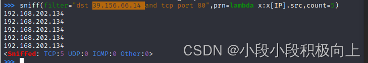 >>> sniff(filter="dst 39.156.66.14 and tcp port 80",prn=lambda x:x[IP].src,count=5)