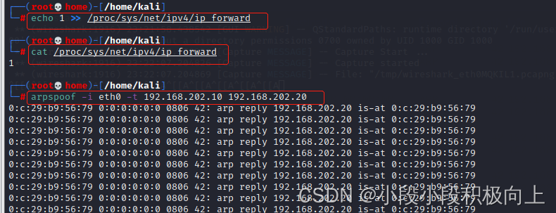 在主机上开启转发功能: root@kali:~# echo 1 >> /proc/sys/net/ipv4/ip_forward