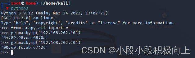 Scapy中有一个getmacbyip()函数,这个函数的作用是给出指定IP地址主机的硬件地址。