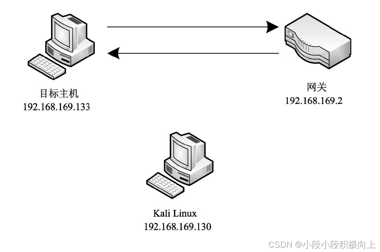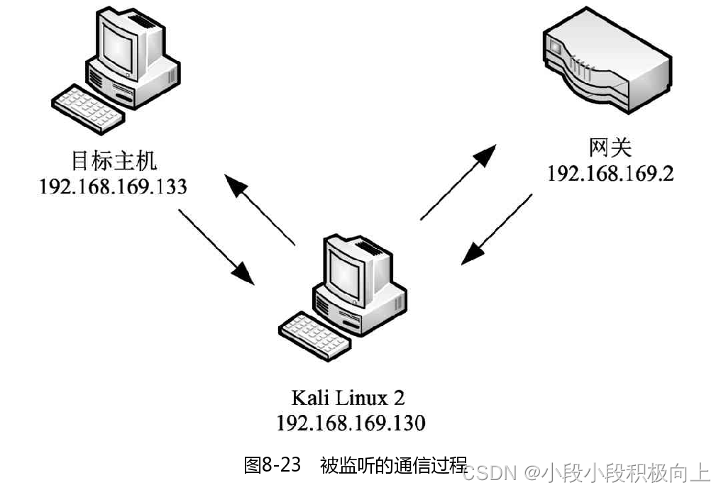 而中间人欺骗的原理就是要让目标主机误认为Kali Linux才是网关,同时让网关误认为Kali Linux才是目标主机,这样两者之间的通信方式就变成了如图所示的形式