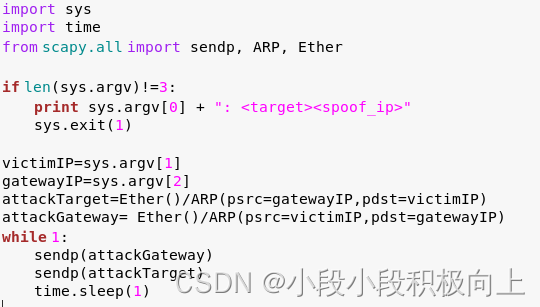 现在编写一个完整的ARP欺骗程序。这个脚本 运行的时候 是欺骗 受害者的