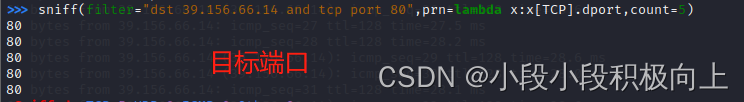 >>> sniff(filter="dst 39.156.66.14 and tcp port 80",prn=lambda x:x[TCP].dport,count=5)
