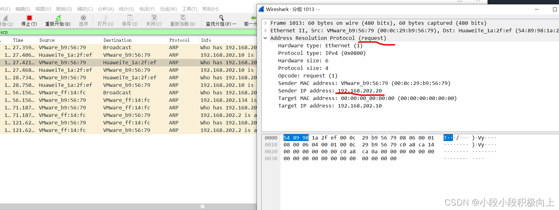 (4)硬件类型:1表示以太网,使用两位十六进制表示为\x00\x01。