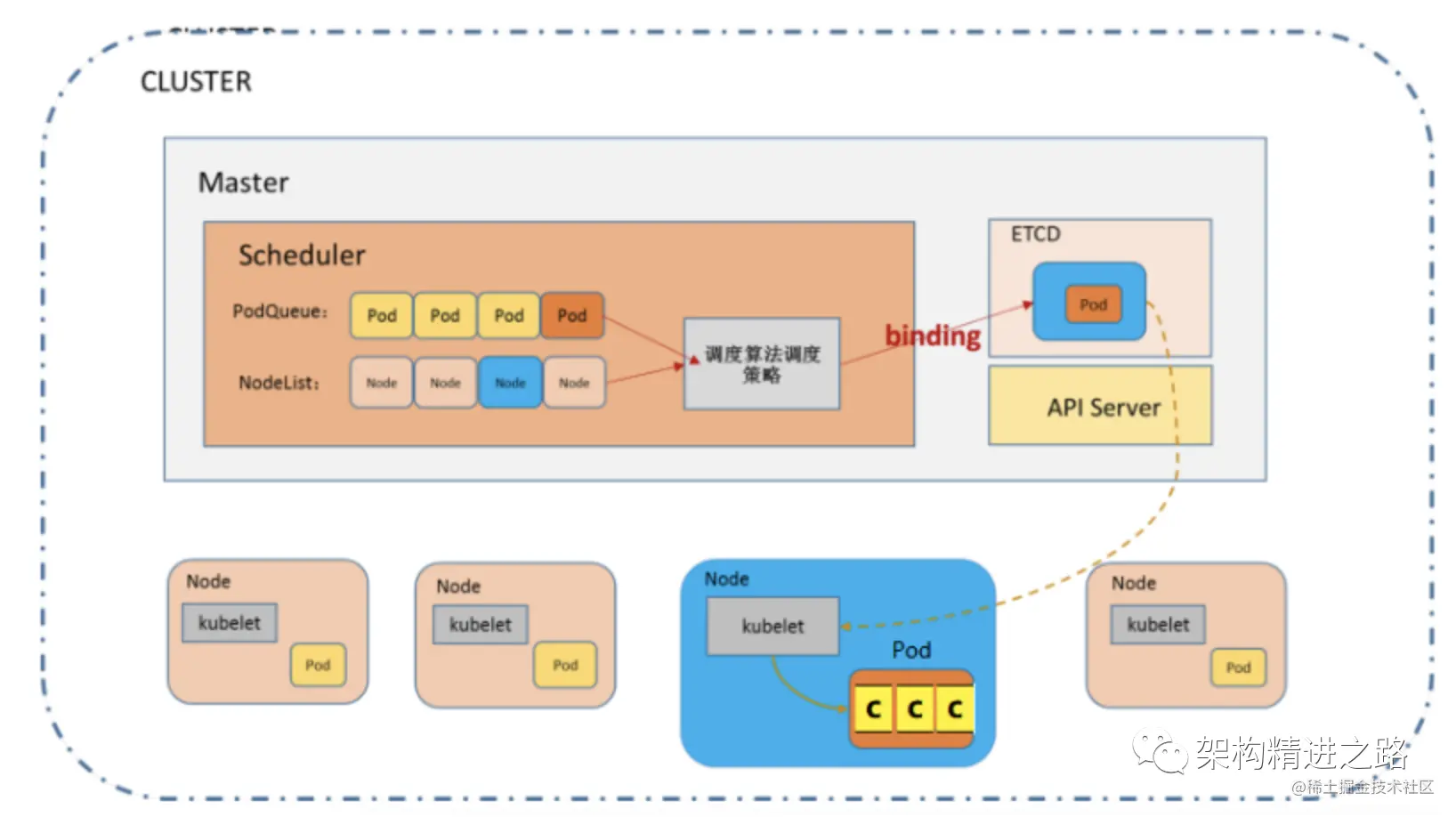 - apiserver 触发 watch 机制准备创建 pod,信息转发给调度器 Scheduler,Scheduler 使用调度算法选择 node,然后将 node 信息给 api server,api server 将绑定的 node 信息写入 etcd。