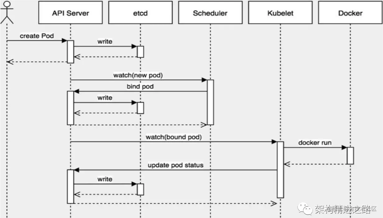 - 创建完成之后反馈给 kubelet, kubelet 又将 pod 的状态信息给 api server, api server 又将 pod 的状态信息写入 etcd。