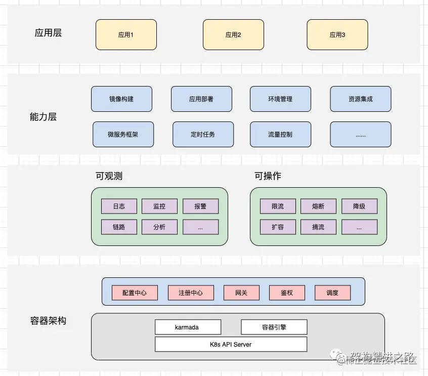 下图是企业服务云平台正在实现的云上架构能力的一幅蓝图,其中服务容器化作为云平台基础中的基础能力。在容器的编排和管理上最基础能力上实现扩容、限流等可操作 api 和日志、监控等可观测的 api。上层能力层可通过这些 api 提供服务构建,部署,流量控制等功能。