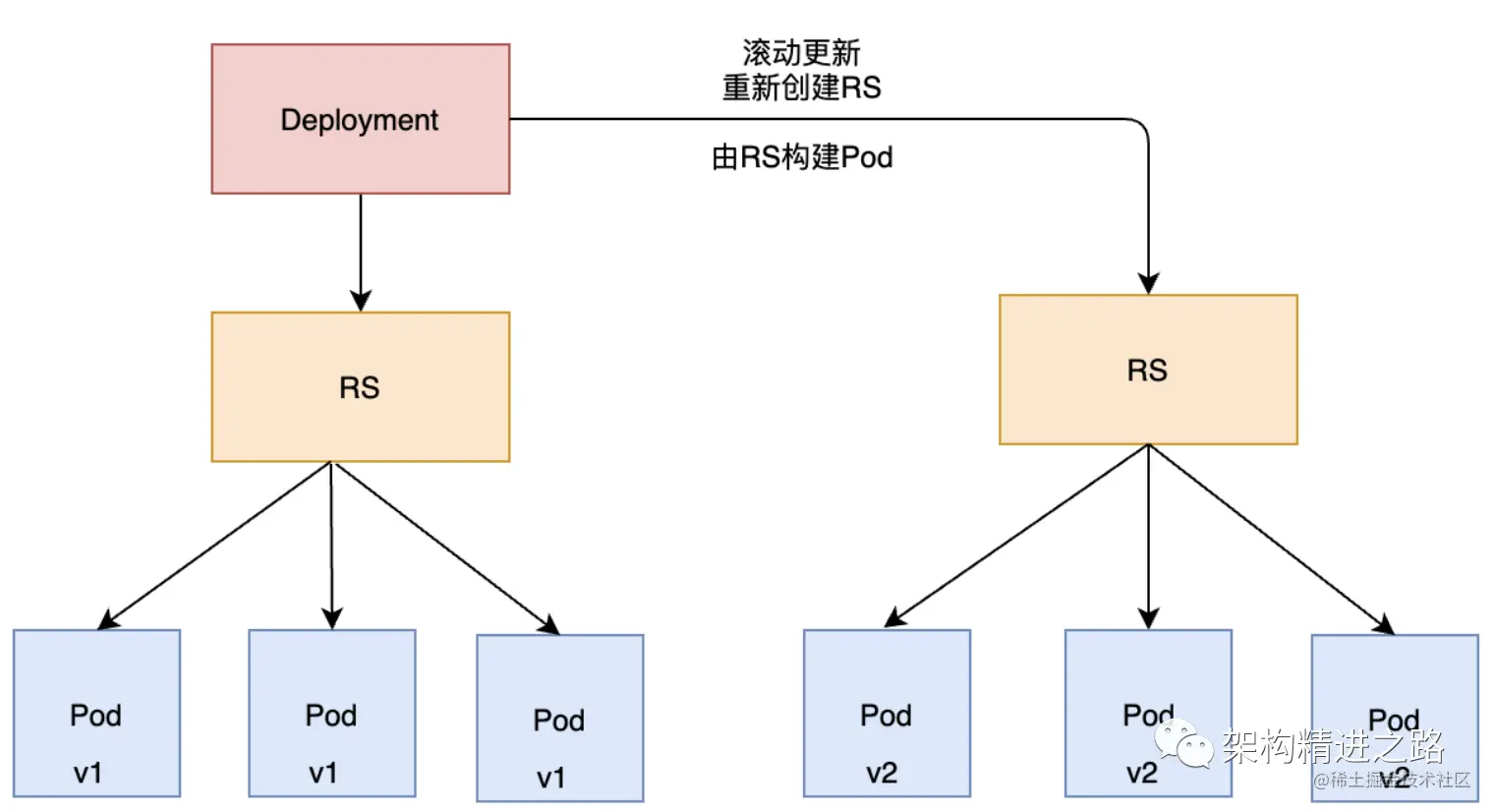 Deployment 不仅可以滚动更新,还可以进行回滚,如何发现升级到 V2 版本后,发现服务不可用,可以回滚到 V1 版本。