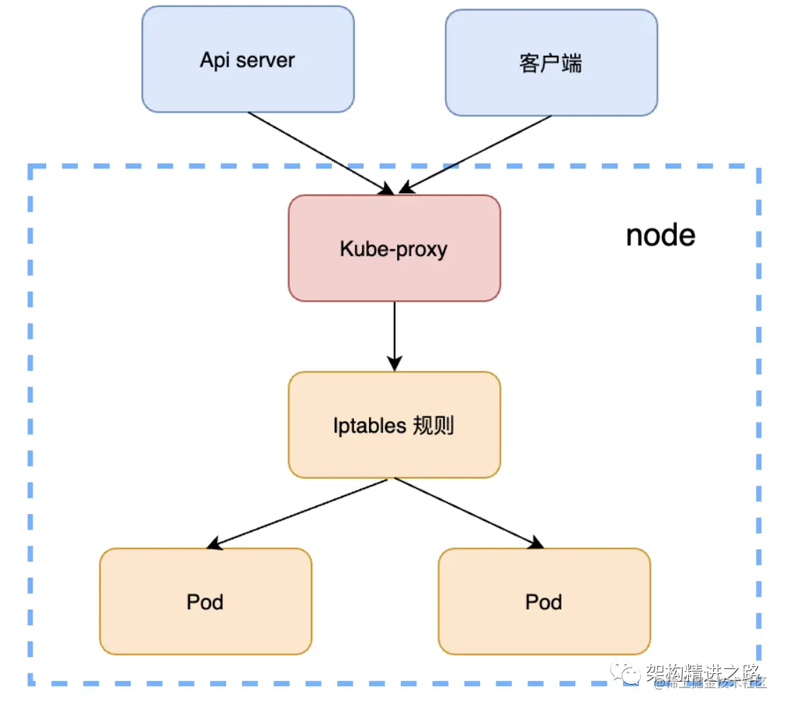在 Kubernetes 集群的每个 Node 上都会运⾏⼀个 kube-proxy 服务进程,其核⼼功能是将到某个 Service 的访问请求转发到后端的多个 Pod 实例上。kube-proxy 本质上类似一个反向代理。我们可以把每个节点上运行的 kube-proxy 看作 service 的透明代理兼负载均衡器。kube-proxy 也监听 api server 中 service 与 Endpoint 的信息, 通过配置的 iptables 规则,请求通过 iptables 直接转发给 pod。
