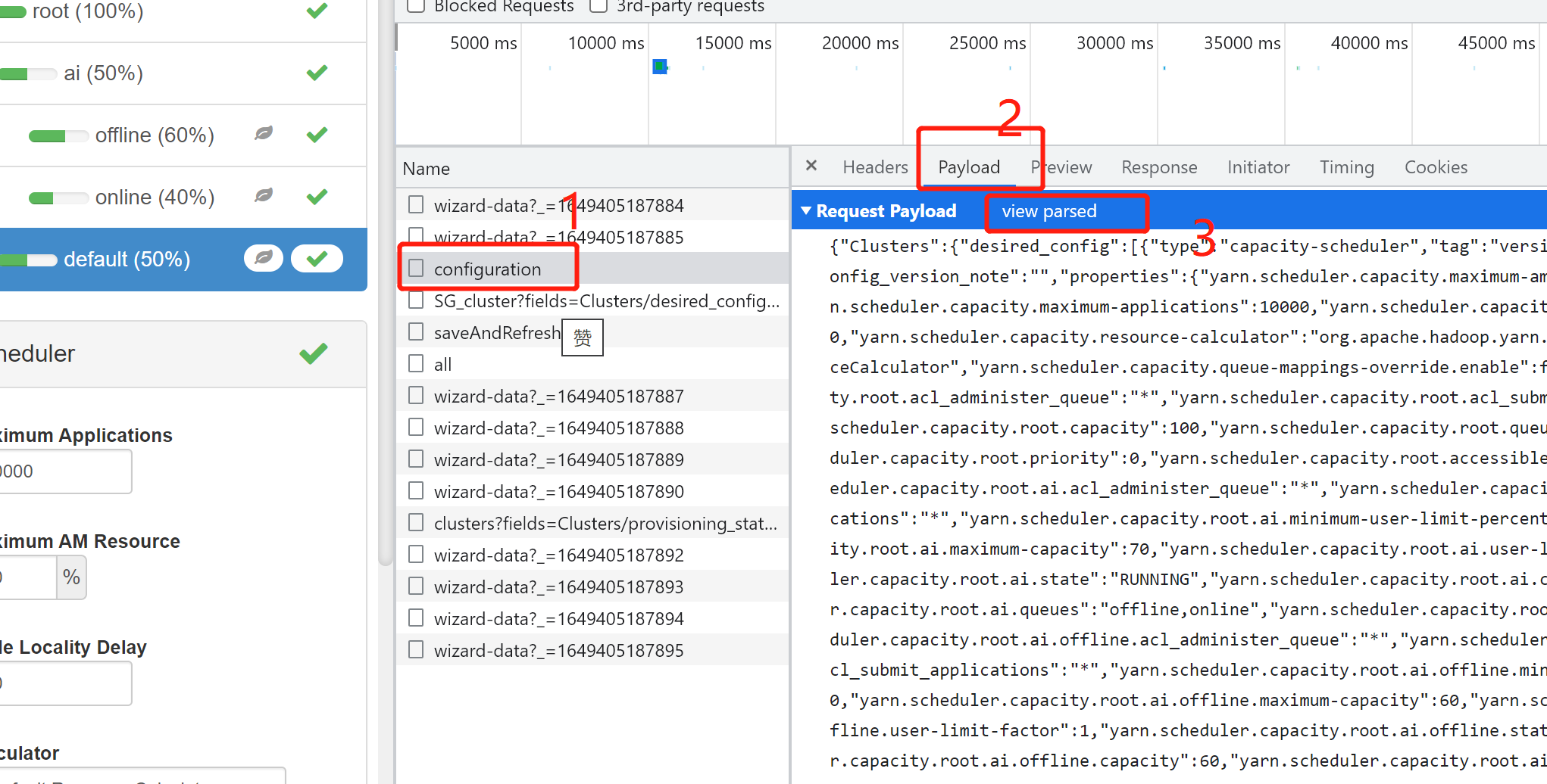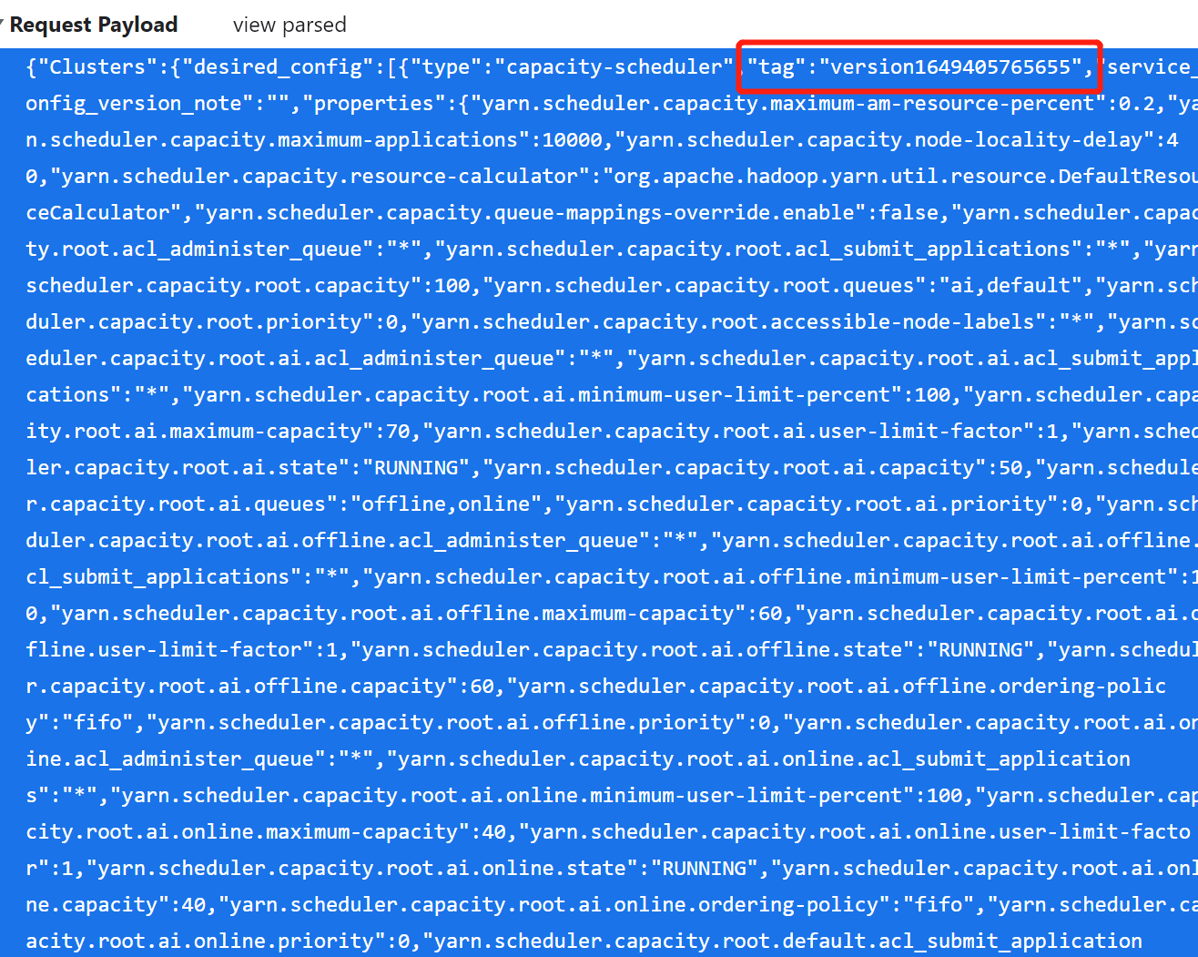 这个json串里面包含了我们设置yarn执行计划所需的队列资源大小设置的相关配置,我们把这个大串的json拷贝出来,后面要用。