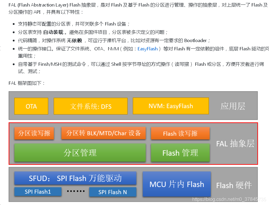 FAL:(Flash Abstraction Layer) Flash 抽象层,是对 Flash 及基于 Flash 的分区进行管理、操作的抽象层,对上层统一了 Flash 及 分区操作的 API