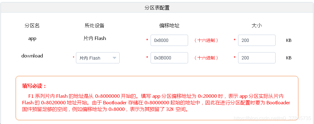 boot | 0x8000000 | 自定义 | 片内FLASH | 下载待更新固件,更新app分区 |