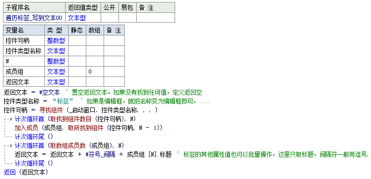 子程序里,写遍历所有,后面再读取出来,用了2个循环,也可以自己只在一个循环里直接操作的,但是第2个循环一般会加过滤,就是说有一些标签可能是不需要操作的,而有一些则要操作的,过滤条件多的话,都堆在一个循环里就会显得比较乱,也容易出错了。