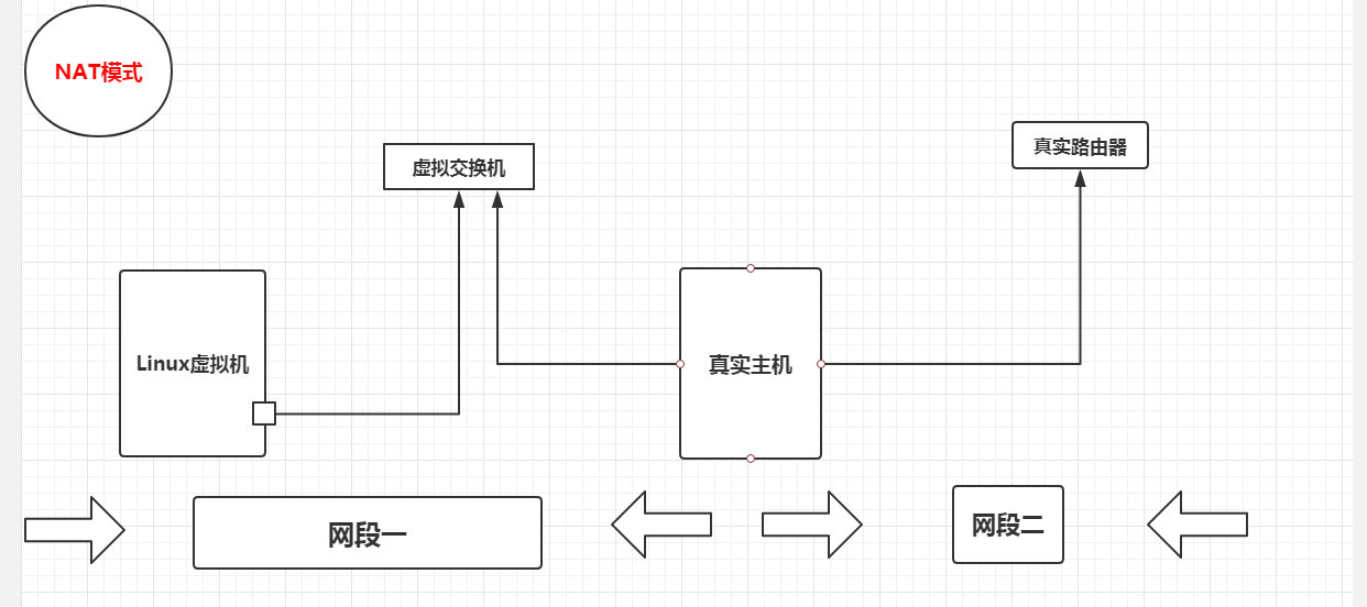 所谓nat模式,就是虚拟系统会通过宿主机的网络来访问外网,而这里的宿主机相当于有两个网卡,一个是真实网卡,一个是虚拟网卡,真实网卡相当于链接了现实世界的真实路由器,而宿主机的虚拟网卡,相当于链接了一个可以认为是虚拟交换机(这个虚拟交换机他同时链接了虚拟系统(linux)和宿主机),这个时候的虚拟网络想访问外网,就必须通过宿主机的IP地址,而外面看来也确实是宿主机的IP地址(实则是虚拟机访问的!!),完全看不到虚拟网络局域的内部形式,而这个时候linux和宿主机和虚拟交换机形成一个网段,宿主机和真实路由形成一个网段!!