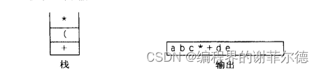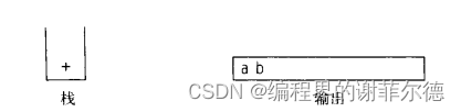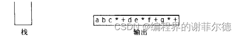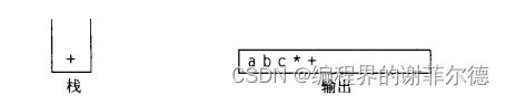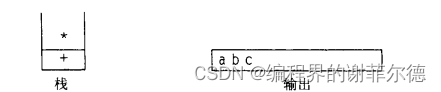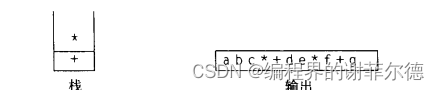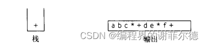 再往后读到的符号是“+”。将“*”弹出并输出,然后将“+”压入栈中。这以后,读到f并输出