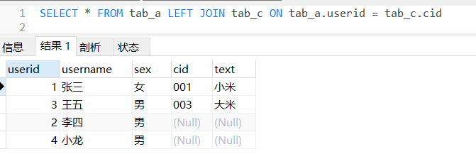 左外连接的结果包括 LEFT OUTER子句中指定的左表的所有行。如果左表的某行在右表中没有匹配行,则在相关联的结果中右表对应行为空值。