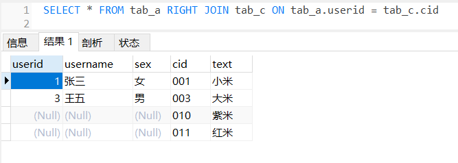 右外连接是左外连接的反向连接。查询结果与左外连接正好相反。