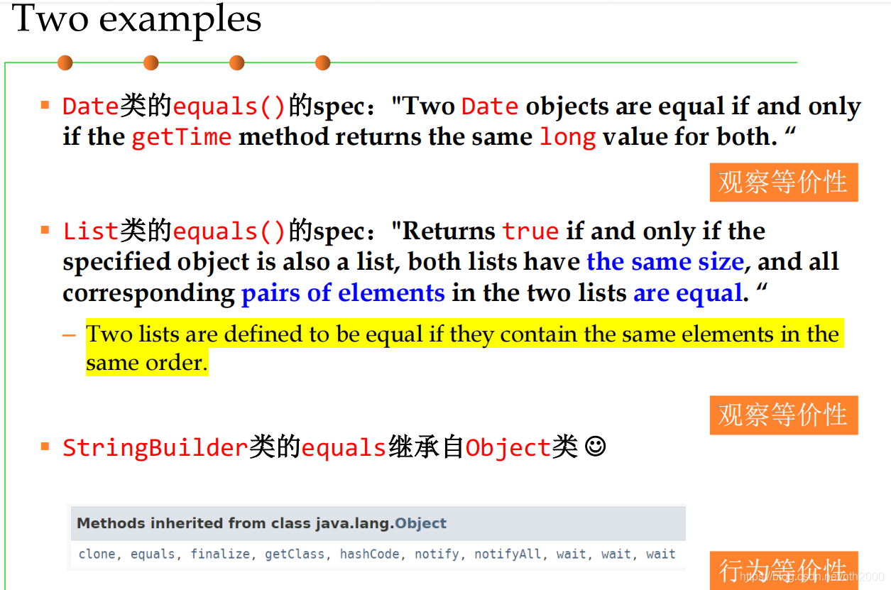 -JAVA对其大部分可变数据类型使用观察等价性。例如,如果两个LIST中包含相同顺序的元素,则equals应该返回True.例如,如图所示:
