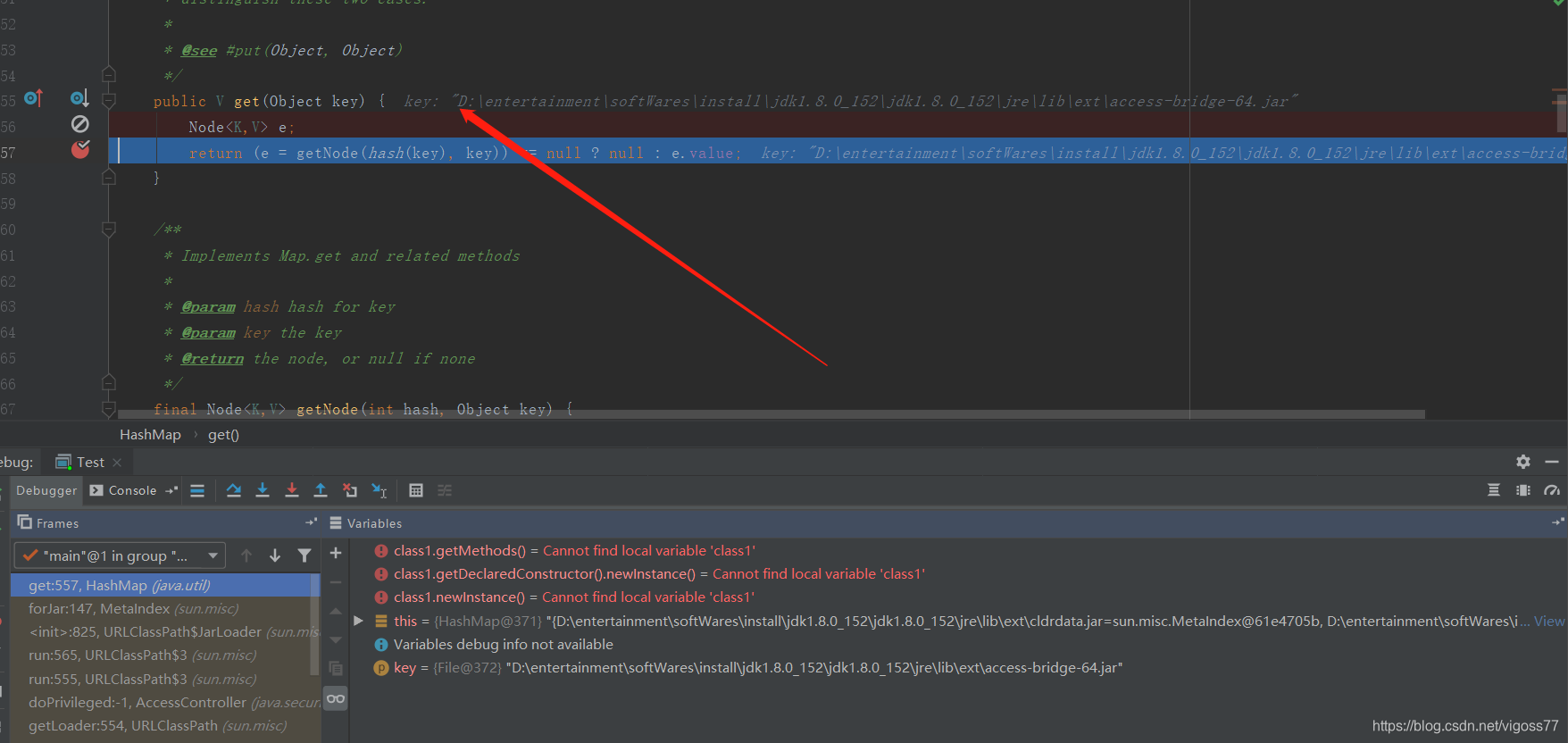 我用的idea,在阅读HashMap的源码时候,我大体看懂了。但整体的一个数据具体储和流程我想用idea去走下断点,然后我就在自己的springboot项目里写了个测试类,然后简简单单、板板正正的new HashMap,然后put一下,get一下。然后我就点debug按钮开始执行了。然后很顺利的渗透到HashMap的内部,但TM遇到了一个骚问题(请允许我用一个艹),如下: