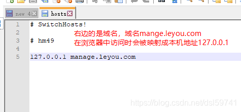 是用来做域名和ip地址的映射的。我在浏览器中输入了数据请求地址:manage.leyou.com:9001,hosts文件里的映射是manage.leyou.com映射到本机地址,那么manage.leyou.com:9001就会被映射成127.0.0.1:9001地址,实际上在访问过程中走的是映射后的地址,但是浏览器依然显示的域名地址