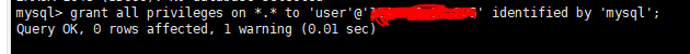 grant all privileges on *.* to 'user'@'192.168.0.1' identified by 'mysql';解释:*.* 表示所有数据权限,192.168.0.1是当前的举例IP实际操作时换成自己的从库安装mysql的服务器外网ip,mysql是当前的账号密码