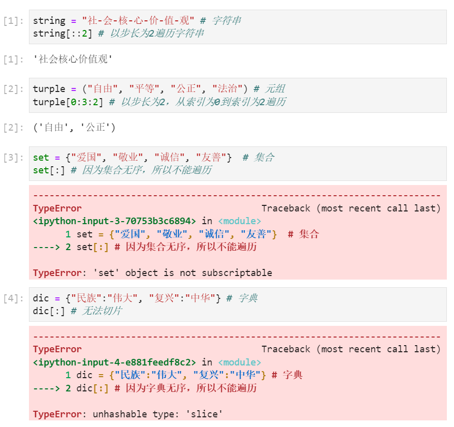 切片操作是访问序列中元素的一种方法,可以访问一定范围内的元素。通过切片操作可以生成一个新的序列。在Python中,序列类型包括字符串、列表、元组、集合和字典,但是集合和字典不支持切片操作。(序列类型举例见图2)