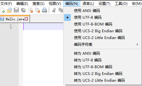 若为notepad++ 则在上方工具栏的编码选项里更改